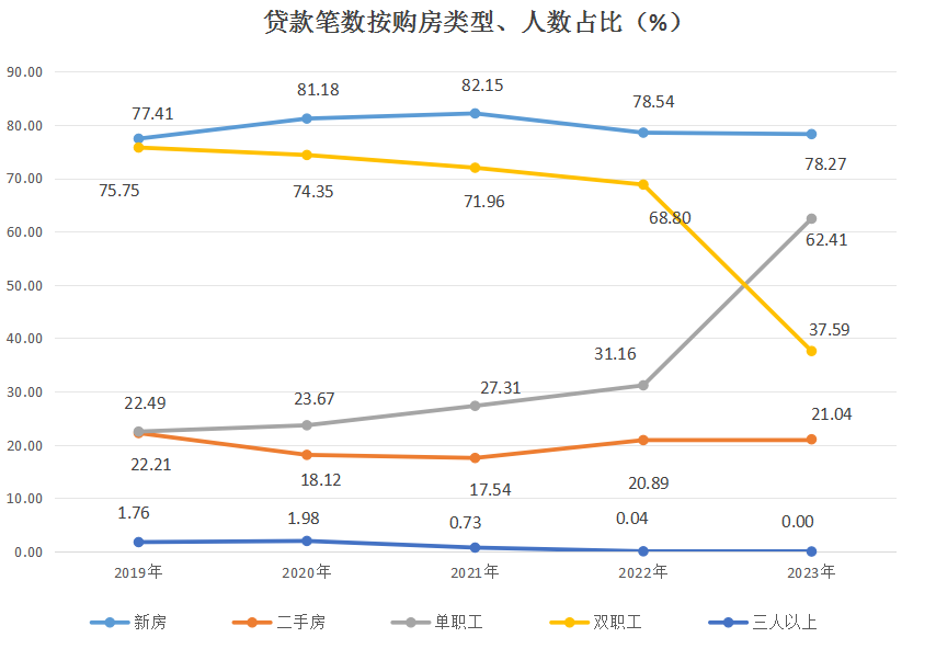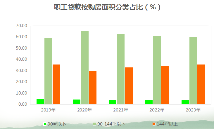 职工贷款笔数中,购房建筑面积90(含)平方米以下占4.2%,90-144(含)平方米占60.23%,144平方米以上占35.57%。购买新房占78.27%,购买二手房占21.04%,建造、翻建、大修自住住房占0.52%,其他占0.17%。
