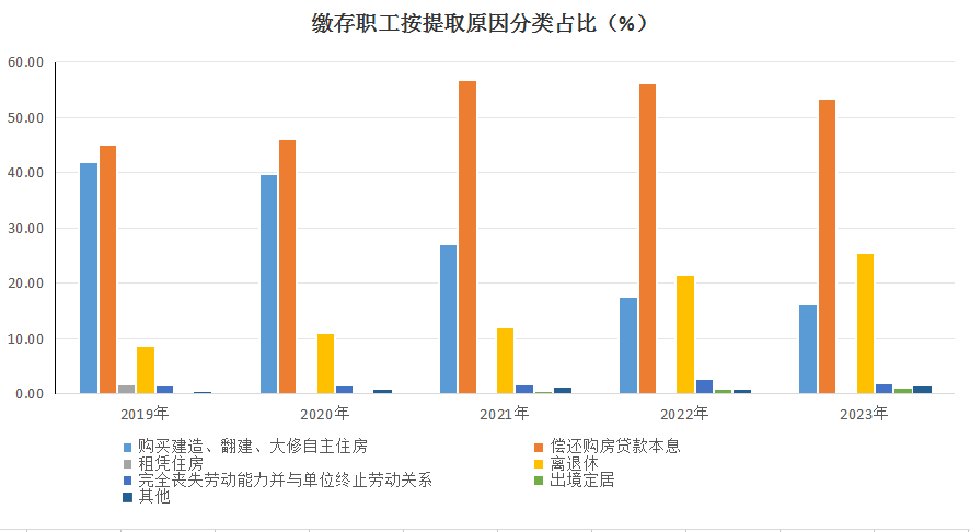 非住房消费类提取,离休和退休提取占25.56%,完全丧失劳动能力并与单位终止劳动关系提取占1.93%,出境定居占1.08%,死亡或者宣告死亡占0.55%,其他占0.83%。