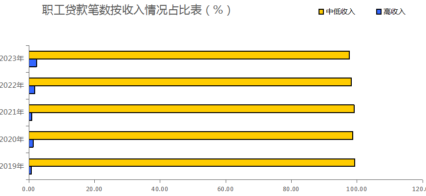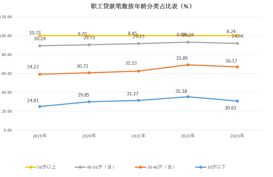 贷款职工中,30岁(含)以下占30.63%,30岁-40岁(含)占36.17%,40岁-50岁(含)占24.96%,50岁以上占8.24%;购买首套房申请贷款占78.22%,购买二套及以上申请贷款占21.78%;中、低收入占97.65%,高收入占2.35%。