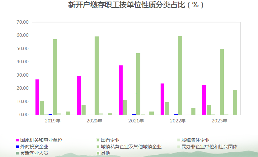 新开户职工中,国家机关和事业单位占22.63%,国有企业占7.61%,城镇集体企业占0.21%,外商投资企业占0.51%,城镇私营企业及其他城镇企业占49.8%,民办非企业单位和社会团体占0.44%,其他占18.8%;中、低收入占99.61%,高收入占0.39%。