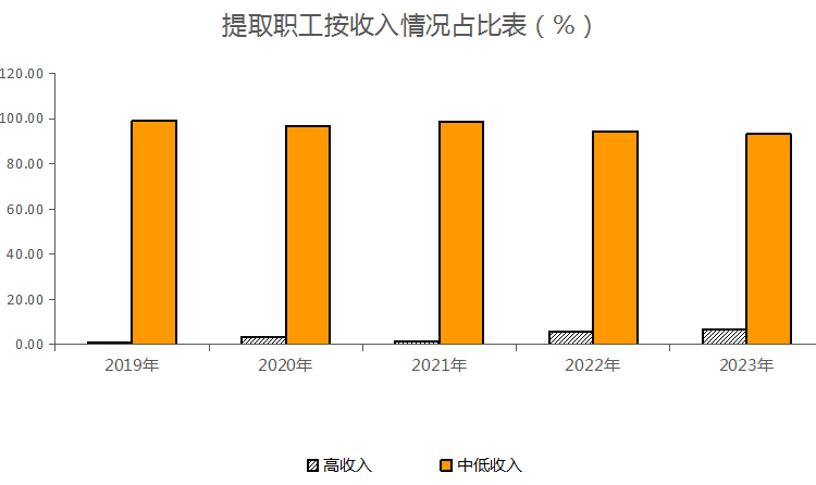 提取职工中,中、低收入占93.13%,高收入占6.87%。