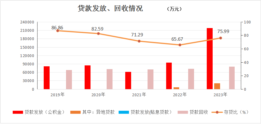 1.个人住房贷款。单缴存职工最高额度60万元,双缴存职工最高额度80万元。对“二孩”“三孩”家庭购房,贷款额度分别上浮10%、20%。全面开展商品房预告及预抵押登记,于4月起存量二套公积金贷款利率上浮1.1倍,取消流动性调节系数上浮机制,推行贷款倍数与流动性调节系数挂钩的动态调整机制。将“存贷挂钩”贷款倍数由10倍提至20倍,贷款最低保障线从15万元提至20万元。2023年,发放个人住房贷款0.42万笔21.87亿元,同比2022年笔数增加0.16万笔增长61.54%,金额增加12.34亿元增长129.49%。收回个人住房贷款8.05亿元。2023年末,累计发放个人住房贷款6.2万笔133.07亿元,同比分别增长7.27%、19.67%,贷款余额61.31亿元同比增加13.81亿元增长29.07%。个人住房贷款余额占缴存余额的75.99%,比上年增加10.32个百分点。