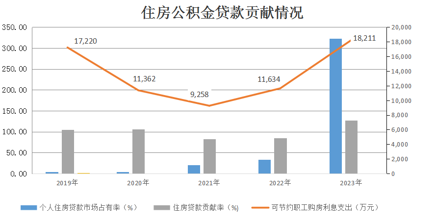 个人住房贷款。2023年,支持职工购建房64.66万平方米,年末个人住房贷款市场占有率为322.47%,比上年末增长289.58个百分点。通过申请住房公积金个人住房贷款,可节约职工购房利息支出18211万元。