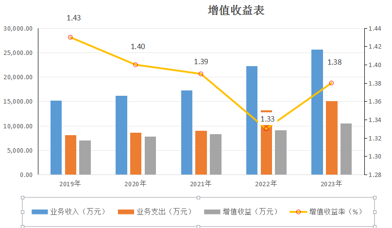 (三)增值收益:2023年,增值收益10538.58万元,同比2022年增加1463.15万元增长16.12%。增值收益率1.38%,比上年增加0.05个百分点。