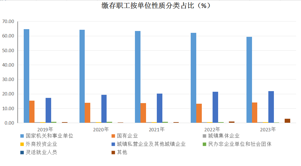 缴存职工中,国家机关和事业单位占59.46%,国有企业占14.24%,城镇集体企业占0.58%,外商投资企业占0.68%,城镇私营企业及其他城镇企业占21.87%,民办非企业单位和社会团体占0.31%,其他占2.86%;中、低收入占97.59%,高收入占2.41%。