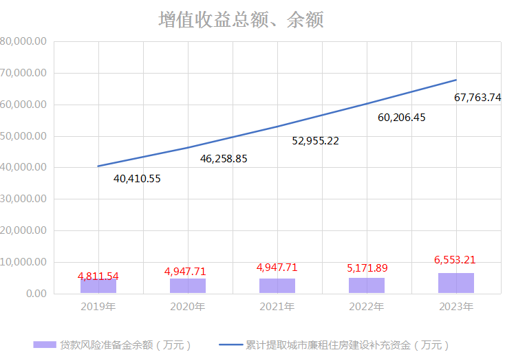 2023年末,贷款风险准备金余额6553.21万元。累计提取城市廉租住房(公共租赁住房)建设补充资金67763.74万元。