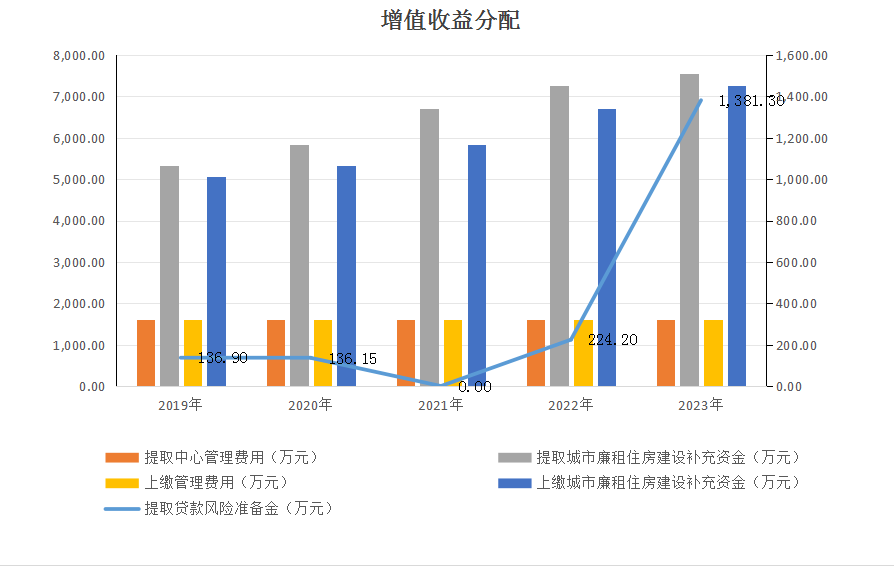 (四)增值收益分配。2023年,提取贷款风险准备金1381.3万元,提取管理费用1600万元,提取城市廉租住房(公共租赁住房)建设补充资金7557.29万元。
