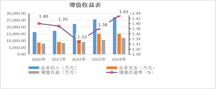 (三)增值收益。2024年,增值收益12124.55万元,比2023年增加1585.97万元增长15.05%。增值收益率1.43%,比上年增长0.05个百分点。