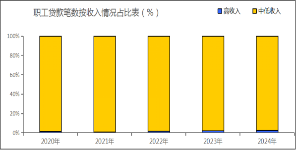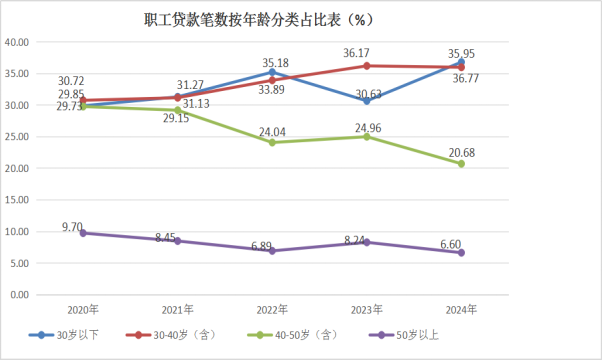 贷款职工中,30岁(含)以下占36.77%,30岁-40岁(含)占35.95%,40岁-50岁(含)占20.68%,50岁以上占6.60%;购买首套房申请贷款占64.86%,购买二套及以上申请贷款占35.14%;中、低收入占97.32%,高收入占2.68%。