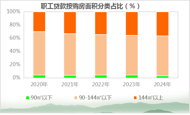 职工贷款笔数中,购房建筑面积90(含)平方米以下占3.05%,90-144(含)平方米占60.62%,144平方米以上占36.33%。购买新房占64.86%,购买二手房占35.14%,建造、翻建、大修自住住房占0.35%,其他占0.47%。