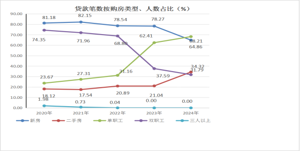 贷款职工中,30岁(含)以下占36.77%,30岁-40岁(含)占35.95%,40岁-50岁(含)占20.68%,50岁以上占6.60%;购买首套房申请贷款占64.86%,购买二套及以上申请贷款占35.14%;中、低收入占97.32%,高收入占2.68%。