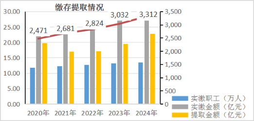 (一)缴存。2024年,新开户单位384家,净增单位77家,新开户职工1.29万人,减少职工0.13万人;实缴单位3312家,实缴职工13.50万人,缴存额28.55亿元,分别同比增长9.23%、1.89%、2.69%。2024年末,缴存总额309.63亿元,同比2023年增长10.16%;缴存余额86.40亿元,同比增加5.72亿元增长7.08%。