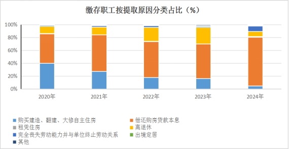 住房消费类提取,购买、建造、翻建、大修自住住房占4.54%,偿还购房贷款本息占76.05%,租赁住房占1.07%。