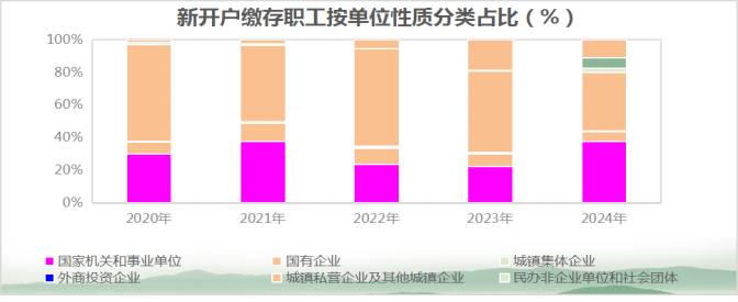 新开户职工中,国家机关和事业单位占37.61%,国有企业占6.04%,城镇集体企业占0.1%,外商投资企业占0.46%,城镇私营企业及其他城镇企业占35.76%,民办非企业单位和社会团体占2.56%,灵活就业缴存占6.71%,其他占10.76%;中、低收入占99.66%,高收入占0.34%。