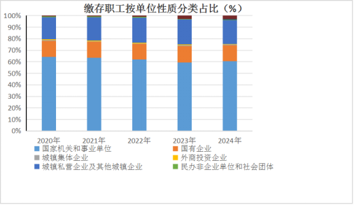 缴存职工中,国家机关和事业单位占60.43%,国有企业占14.08%,城镇集体企业占0.47%,外商投资企业占0.66%,城镇私营企业及其他城镇企业占20.44%,民办非企业单位和社会团体占0.44%,灵活就业缴存占0.57%,其他占2.91%;中、低收入占96.98%,高收入占3.02%。